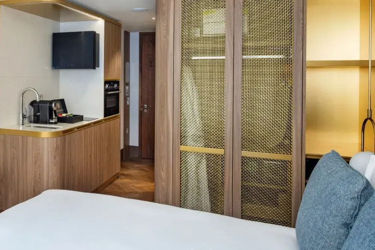 Historic Studio at Dao blends original timber panelling and ironmongery with modern lighting and terrazzo-inspired finishes. Enjoy a bespoke kitchenette, dining area, luxurious bathroom, sunlit interiors, and a relaxing courtyard.